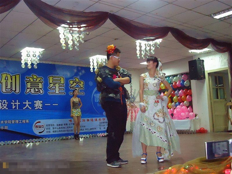 “环保世界,创意星空”——管理工程系第三届环保主题时装设计大赛(科技文化节系列活动之一)于5月18日晚在院图文信息中心大学生活动中心举行。在优美的旋律声中,校园模特们身着设计者们用塑料桌布、光碟、报纸、蚊帐、窗帘等废旧物品精心设计制作出来晚礼服、休闲套装,走上舞台,向大家展示自己的优美身姿以及设计者的独具匠心的创意设计,台下的观众不时地爆以热烈的掌声,同时,积极地参与现场评选。(稿件来源:管理工程系)