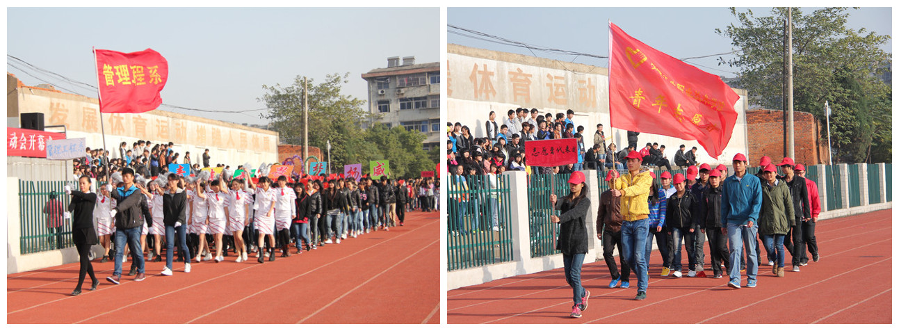 开幕式第一部分,学院各系部运动员代表及工作人员、志愿者列队入场。随着进行曲的响起,各系部运动员们排着整齐的队伍,大步向主席台走来,他们身着各具特点的服饰,面带笑容,喊着口号,昂首阔步,神采飞扬,展现出当代大学生特有的朝气和活力。