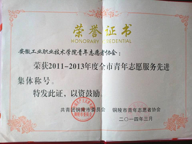 近日,共青团铜陵市委、铜陵市青年志愿者协会联合下发《关于表彰2011—2013年度全市青年志愿服务先进集体和优秀青年志愿者的决定》,对2011年以来全市各级青年志愿者服务集体和个人进行了表彰。学院青年志愿者协会被授予“2011—2013年度志愿服务先进集体”荣誉称号。这也是继年初获得由市文明办颁发的“铜陵市2013年度志愿服务先进集体”之后的又一项志愿服务荣誉。