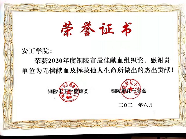 近日,在合肥市举办的安徽省6.14世界献血者日主题宣传活动中,金年会两位学生姚传宗、吴思佳分别获得安徽省2021年高校学生无偿献血先进个人及先进个人入围奖,此外,学院荣获铜陵市卫健委和铜陵市红十字会授予的最佳献血组织奖,机械工程系5位学生获2018-2019年度全国无偿献血志愿服务一星奖。