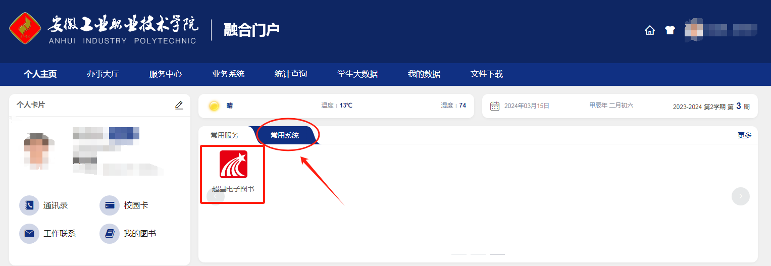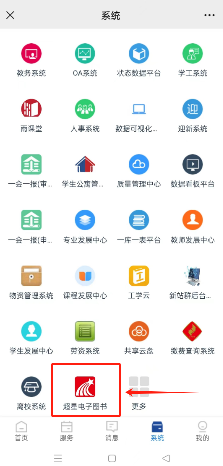 进入“常用系统”,搜索“超星电子图书”,点击进入即可阅读。下载图书后使用超星阅读器进行阅读,体验会更好。