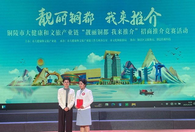 4月24日,铜陵市“靓丽铜都 我来推介”招商推介竞赛在铜官区文化馆圆满落幕。经过激烈角逐,金年会基础部朱红玲老师以《筑梦铜陵,“铜”心而行》为主题,凭借对铜陵区位优势、文旅产业亮点、营商环境保障及“技能人才定制”模式的深度解读,在全市23支市直单位参赛队伍中脱颖而出,斩获大赛一等奖。铜陵市人民政府副市长杨文萍出席活动并为一等奖获得者颁奖。