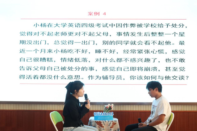 “谈心谈话”环节通过情景再现的方式展开,参赛辅导员各展风采,凭借扎实的专业知识、丰富的学生工作经验和真诚的关爱之心,于模拟情境中与助演学生就其在思想、学业、家庭、情感等各方面遇到的困惑和难题开展谈心谈话,思路清晰、反应迅速,充分展现出了出色的沟通协调能力和问题解决能力。