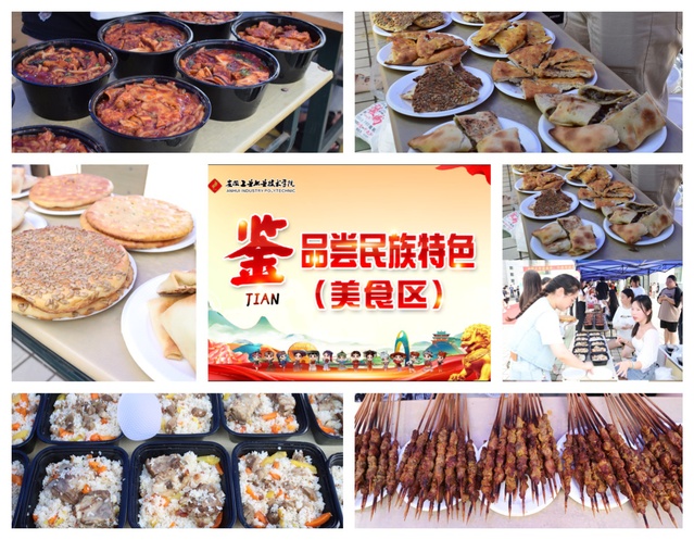 “鉴”特色美食:新疆羊肉串、手抓饭、烤馕等风味美食香气扑鼻,师生凭券有序兑换,在味蕾体验中领略民族饮食文化的独特魅力。