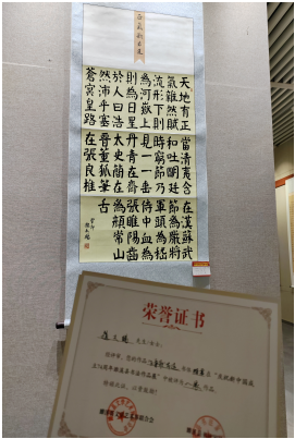 在校园里,身兼系学生会文艺部部长、班级班长兼团支书三职的赵天赐,将书法艺术中的“严谨”与“审美”,融入学生工作的每一处细节。组织文艺活动时,他会用书法元素设计宣传物料,让传统美学走进校园生活;处理班级事务时,他耐心细致,像打磨作品一样对待每一项任务,成为老师眼中的得力助手、同学心中的可靠伙伴;重大节日里,他更以笔墨表达家国情怀。