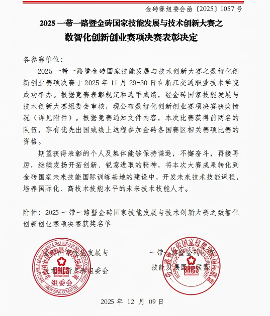 金砖国家技能发展与技术创新大赛是2017年金砖国家最高领导人会晤筹备委员会认可、经中华人民共和国外交部备案、金砖国家工商理事会批准的国际性赛事。今年该项赛事被正式纳入中国高等教育学会发布的《2025全国普通高校大学生竞赛排行榜》,成为高校竞赛评估与管理体系中的重要赛事之一。