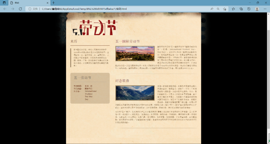 劳动其实可以分为很多种类型,相较于体力劳动,脑力劳动也是我们日常生活中必不可少的工作。借劳动教育宣传周活动为契机,开展一次《五一“劳动最光荣”静态网页设计》活动竞赛,可以让同学们积极运转大脑,消化一下所学到的知识,并应用到实际中来。部分作品展示如下: