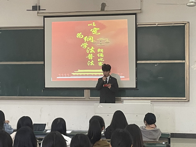 为了进一步加强大学生宪法宣传教育,在大学生中大力弘扬社会主义法治精神、培养社会主义法治理念,引导广大学生成为自觉学法、遵法、守法、用法的新时代好公民,方圆法律社团联合海子经典诗文诵读社团于10月23日下午在阶梯教室103举办了“以宪为纲 学法普法”诵读比赛活动。