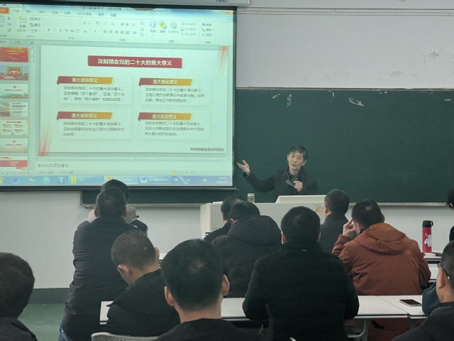 院党委副书记范清义为管理工程系党支部、基础部党支部宣讲党的二十大精神。宣讲以《新时代新征程的政治宣言和行动纲领》为题,从深刻领会党的二十大的重要意义、党的二十大报告的总体框架、准确把握党的二十大精神实质及今后工作的方法和努力方向等5个方面,运用详实的数据、生动的案例,为全体教职工深入浅出阐释了党的二十大精神,全面解读了党的二十大报告中的新观点、新部署、新要求。范书记强调,必须学深悟透做实习近平新时代中国特色社会主义思想,把握好蕴含其中的世界观和方法论,坚持好、运用好贯穿其中的立场观点方法,切实用党的最新理论成果武装头脑、指导实践、推动工作。