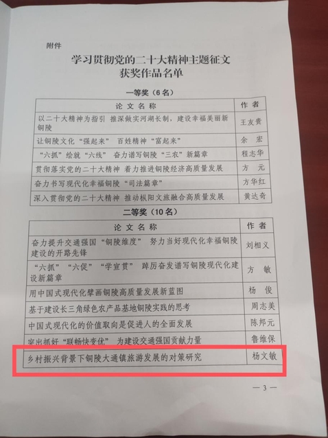 近日,在市委宣传部、市社科联、铜陵日报联合开展的“学习贯彻党的二十大精神”主题征文活动中,学院管理工程系杨文敏老师的论文《乡村振兴背景下铜陵大通镇旅游发展的对策研究》获得二等奖。
