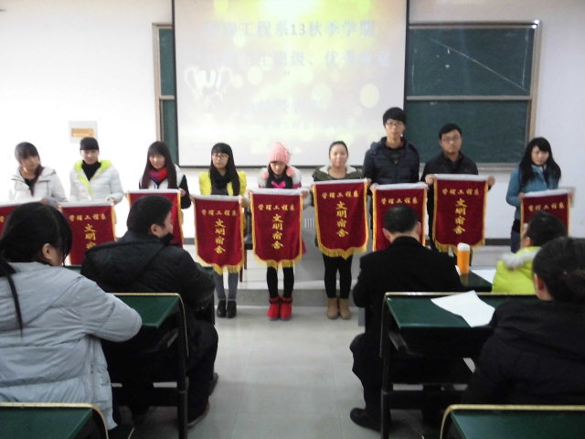 为了进一步推进班级、寝室文明建设,营造温馨舒适的班级、寝室环境,促进学生养成良好的行为习惯和学习习惯,配合学院、系部“两个标准化”的实施。同时也为促进各班级、寝室工作的激情,促进我系“两个标准化”建设更上一个台阶。我系于12月20日下午1点在阶梯101教室召开了全系“优秀卫生班级、优秀寝室”总结暨表彰大会,系党支部书记汤老师、系团总支书记胡老师、系学生工作秘书钟老师出席会议,参加会议的有系学生会干部、全系各班级班长、生活委员及各寝室长。会议由系学生会生活部长主持,会议首先由系生活部致词并就“双优”评选程序进行相关说明。会议现场由系生活部长宣读了全系13秋季学期 “双优”名单,并请系部领导为获奖班级、寝室及个人颁奖。颁奖结束之后由获奖班级和寝室代表发言,会议最终由系团总支书记胡老师对会议进行总结,胡老师在讲话中肯定了我们这学期的工作,并希望获奖寝室今后能再接再厉,做表率作用,去帮扶、影响、带动周围寝室,希望没有获奖的寝室今后的工作继续努力,胡老师的讲话为我们明年全系的卫生工作指明了方向并提出了要求。最后胡老师祝愿我系学生在今后能够出色的表现自己,在安工这片热土上留下美好的回忆,为管理工程系“两个标准化”建设步入新的局面贡献自己的力量!