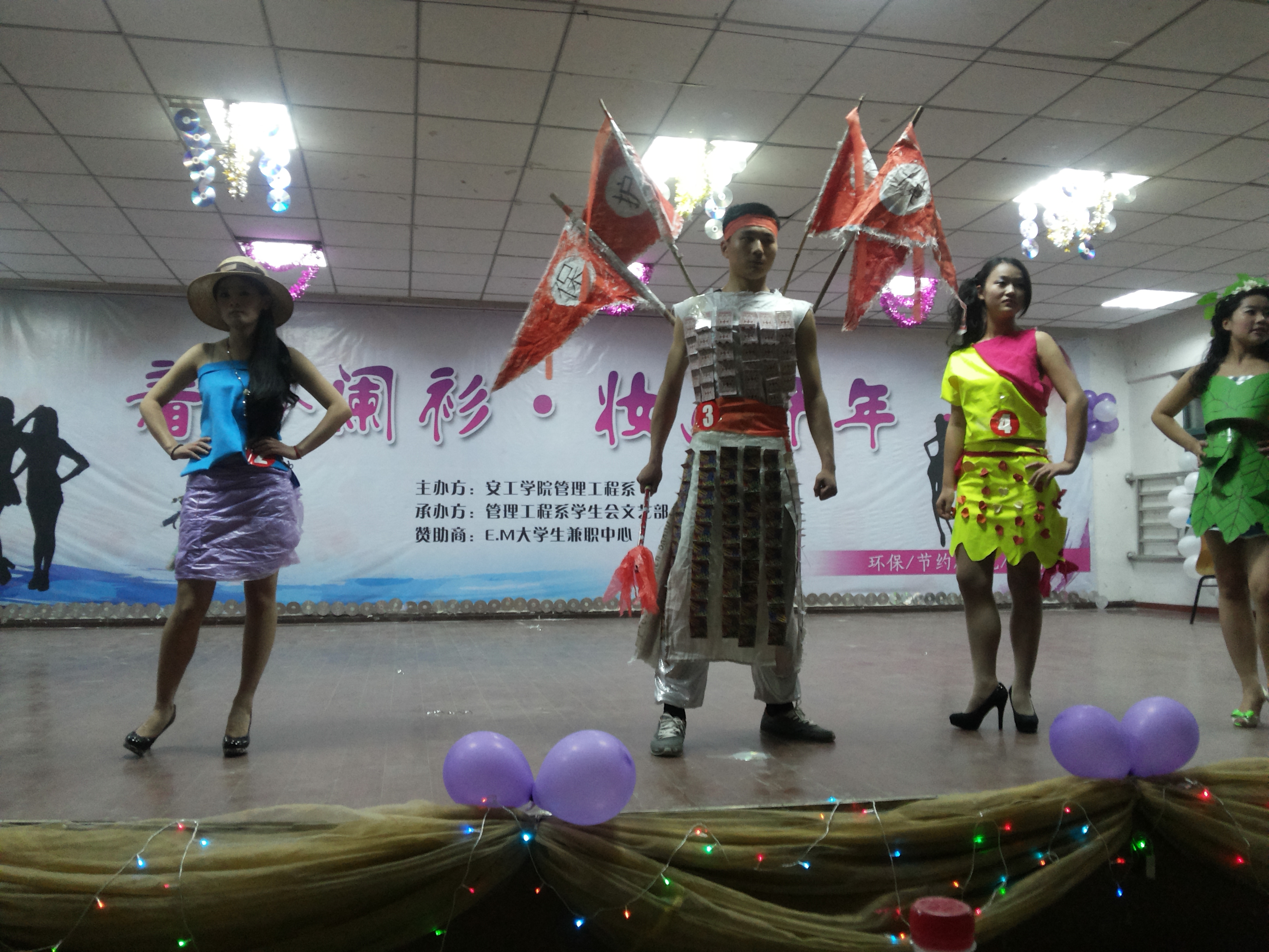 “着梦阑衫·妆点十年”——管理工程系第四届环保主题时装设计大赛于5月16日晚在院图文信息中心大学生活动中心举行。在优美的旋律声中,校园模特们身着设计者们用塑料桌布、光碟、报纸、蚊帐、窗帘等废旧物品精心设计制作出来晚礼服、休闲套装,走上舞台。在熠熠灯光下,跳跃动感的音乐伴曲奏起,五颜六色的舞台灯束不停变换,营造了一个令人陶醉的氛围,选手们尽情释放激情与活力,展现自我的青春风采。台下的观众不时地爆以热烈的掌声,同时还积极地参与现场评选。