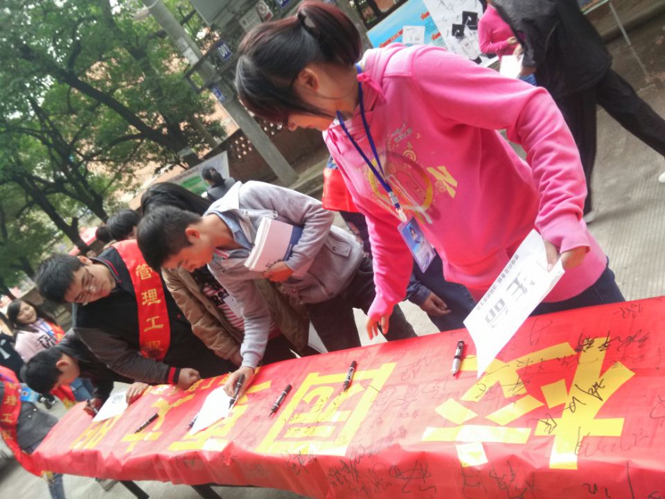 2014年11月6日中午11:45在学院时代华联超市门口举办管理工程系校园控烟青年志愿者活动。青年志愿者们向学生们发放传单,宣传了解烟草的危害及戒烟的技巧,路过的学生和老师们纷纷停下脚步,认真的阅读和聆听,并在志愿书上签下自己的姓名,自觉加入控烟宣传的行列。本次活动主旨在让同学们远离烟草,珍爱生命,为创建文明健康校园做贡献。更希望以本次活动作为一个良好的出发点,使同学们在以后的学习生活中尽量做到少抽烟,不抽烟,创建美好和谐的校园风气。