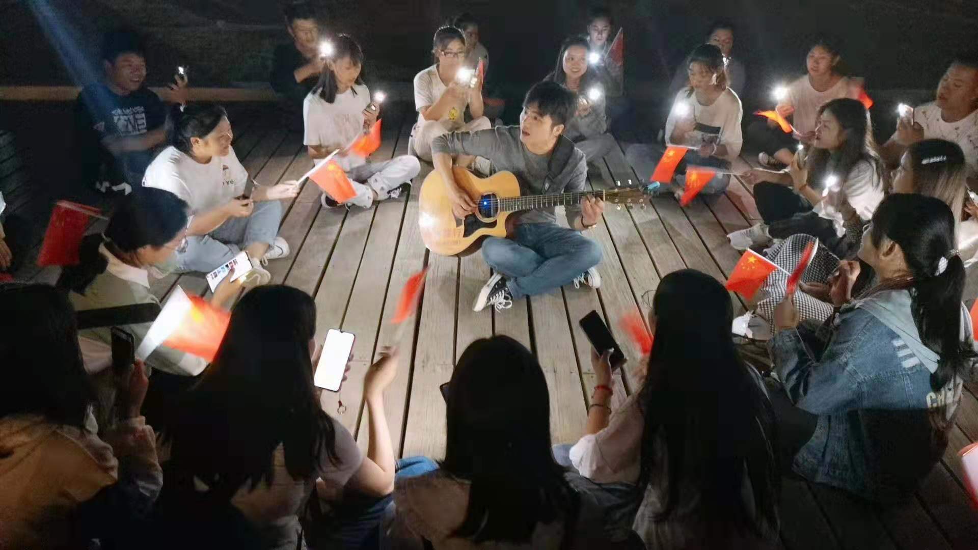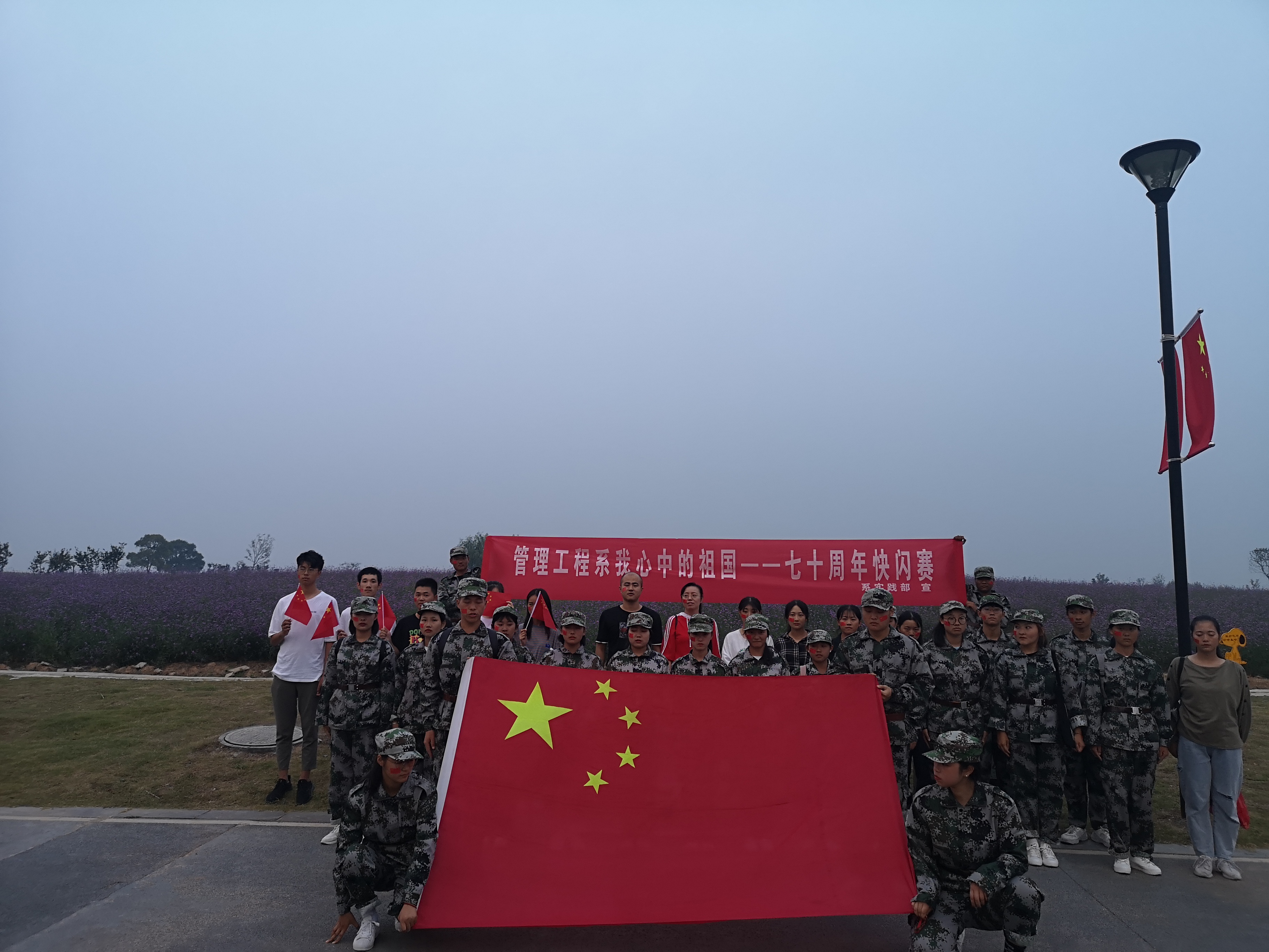 为了庆祝新中国成立70华诞,管理工程系举办了“心目中的祖国快闪,喜迎建国70周年”主题系列活动,引导青年学生弘扬爱国主义精神和勇于担当、主动作为的进取精神,激励青年学生为实现中华民族伟大复兴的“中国梦”不懈奋斗。9月26日下午,19级管理系新生在胡静老师、左永刚老师的带领下来到铜陵西湖湿地,一部分新生踏着昂扬的军姿,齐唱爱国歌曲,好似一股正气响彻云霄,引得行人注视拍摄以及伴唱;其他同学也同样采取各种形式来抒发自己的爱国情怀。天色渐渐黑了,但是同学们不愿离去,盘坐在一起,手持小国旗,听着红色经典,歌唱爱国歌曲,将此次快闪活动推向了高潮,最后活动结束之际,胡静老师深情地对同学说,恰同学少年,希望同学们努力进取,踏实学习,长本领,以实际行动为中华伟大复兴而奋斗。