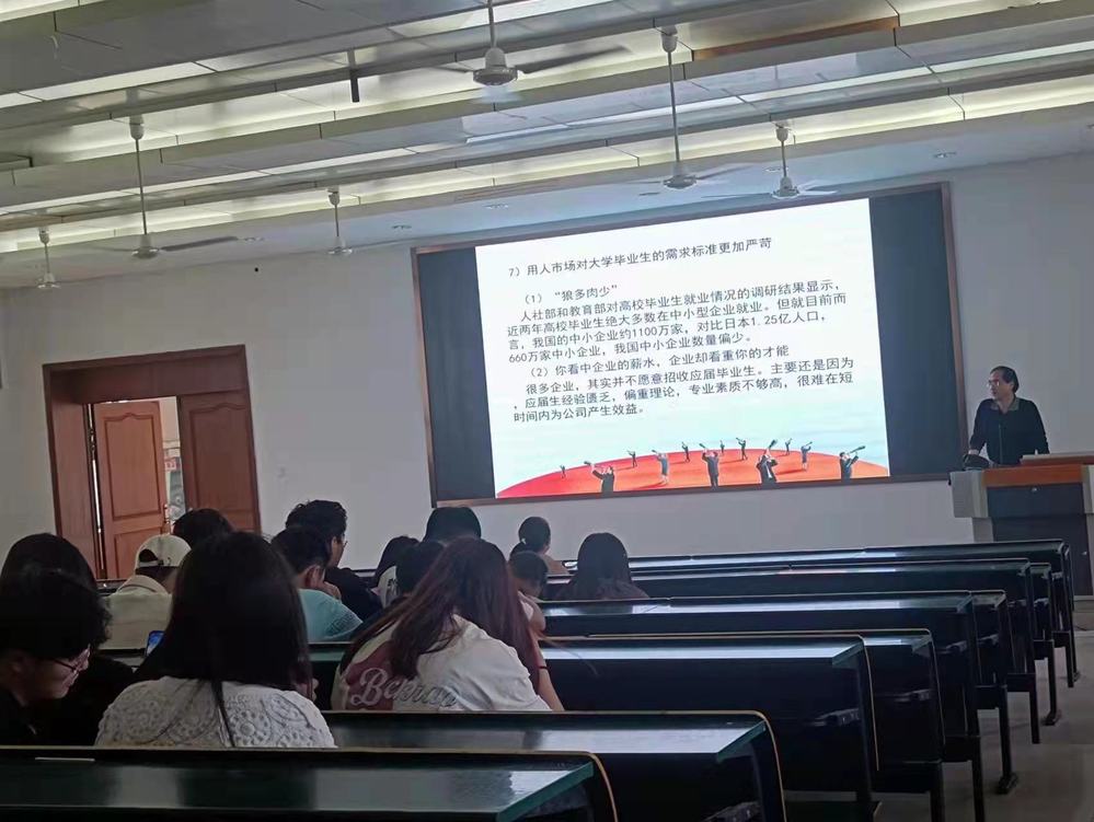 在讲座中,曹主任先对当前的大学毕业生就业现状做出了分析,当前高校毕业大学生人数不断增加,2023届全国普通高校毕业生总规模已经高达1158万,现在的就业形势可谓十分严峻。随后,曹主任向同学们说明了大学生就业难的具体原因,并给学生们提出了相关对策和求职方法,告诫同学们要认真做好自身的职业生涯规划,提前做好就业准备;切记盲目择业,也不要迷茫焦虑,只要提前多做准备,定可以找到心仪的工作。