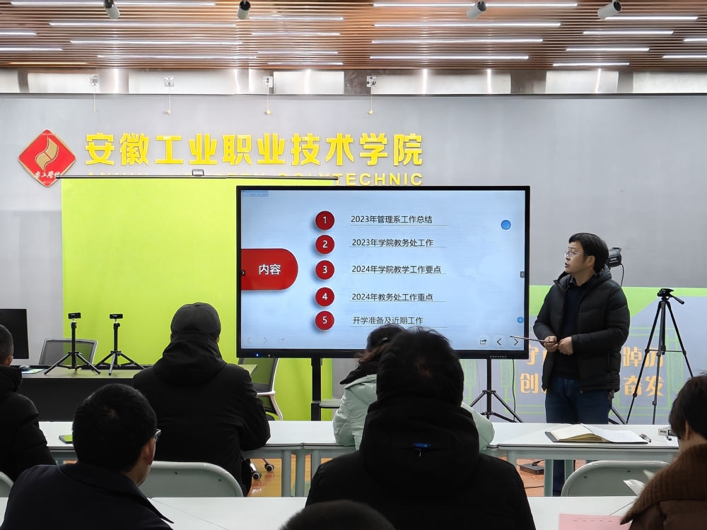会上,曹主任首先传达了学院教代会报告精神,就陈院长在教代会报告中的2023年学院主要成绩和2024年学院重点工作总体部署进行了详细讲述,指出了系部2024年创新重点工作部署和安排。后面吴主任对2023年管理系工作进行了总结,从常规教学、教科研、实训室、课证融合、课赛融合和产教融合六个方面进行了重点说明,指出2023年是学院高质量发展的关键之年,也是学院开启现代职业教育体系改革的元年,在学院的正确领导下,通过我系全体教职工的共同努力下,管理工程系各方面教学工作都取得了一定的进步。接下来对2024年春季学期学院教学工作要点和教务处工作重点进行了说明,就新学期开学准备和近期教学常规工作的具体安排和要求进行了详细阐明,让各位老师都抓紧投入到马上的新学期各项教学准备工作中去。