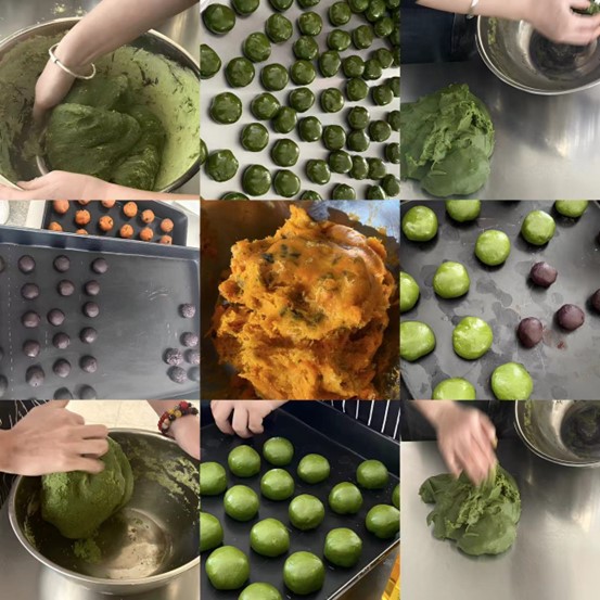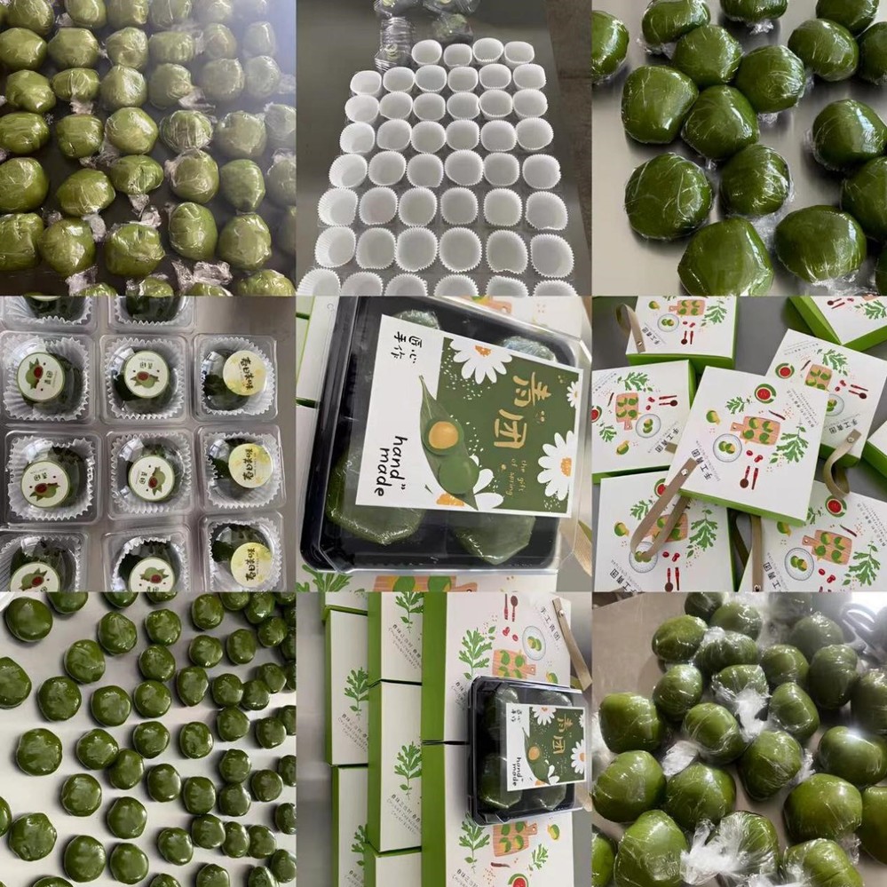 在活动现场,活动现场,同学们们提前准备好了青团粉、牛奶、白糖和馅料等材料。大家分工明确,有的在制作青团皮的面糊,有的制作馅料,有的在擀青团皮和称每个青团皮、馅料多少克一个。全部完成后,大家就正式开始制作青团,把称好的青团揉搓至圆形,用擀面杖擀至成饺子皮一样的大小,然后加入各种爱吃的馅料包起来,最后用保鲜膜包起来,放入准备好的礼盒中帮放整齐,做完后免费让同学们品尝。