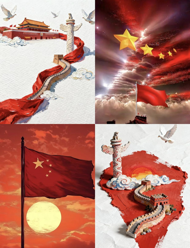 在作品中,有的同学以鲜艳的五星红旗为主角,表达对祖国的热爱;有的同学通过历史事件和人物故事,展现中华民族不屈不挠的奋斗精神;还有的同学结合新时代的发展成就,描绘祖国的繁荣富强.有的同学将自己与天安门、长城等标志性建筑合成,表达对祖国大好河山的热爱;有的同学通过P图重现历史瞬间,致敬革命先烈;还有的同学用鲜艳的色彩和创意构图,展现祖国的繁荣与希望。一幅幅作品构思新颖、画面生动,充分体现了同学们的想象力与爱国情怀。