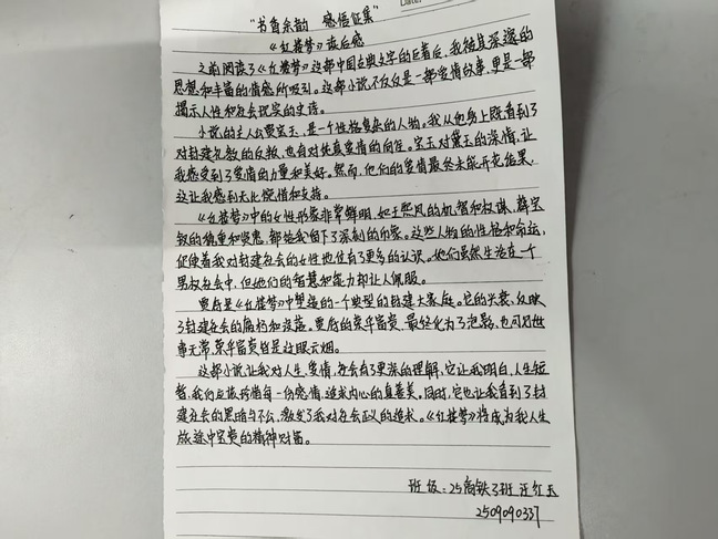 阅读经典,是与伟大灵魂的对话。一等奖获得者同学以中国古典四大名著之一《红楼梦》为创作蓝本,在读后感中细腻剖析了书中人物的命运沉浮与封建家族的兴衰轨迹。她将黛玉的才情孤高、宝玉的叛逆觉醒与时代背景相结合,既感叹于“满纸荒唐言,一把辛酸泪” 的悲剧美学,更从复杂的人物关系中读出了人性的多面与生命的厚重,文字间尽显对经典文学的深刻体悟与敬畏之心。