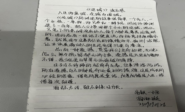 同为一等奖的同学,则将目光投向沈从文先生的经典之作《边城》。她在文中以清新灵动的笔触,勾勒出湘西水乡的淳朴民风与翠翠、傩送之间纯粹而朦胧的情愫,深入挖掘了作品中“美” 与 “爱” 的内核。同学写道,《边城》不仅是一幅诗意的乡土画卷,更教会她在浮躁的当下坚守内心的澄澈与善良,这份对人性之美的珍视与感悟。