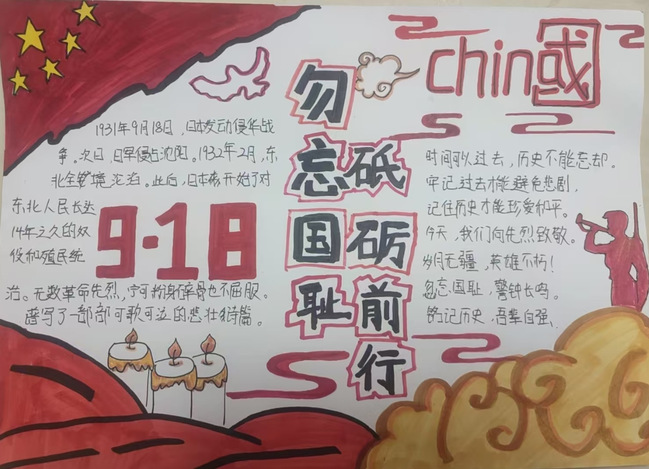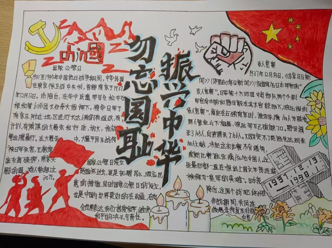 活动当天,同学们怀揣着崇敬与哀思齐聚现场踊跃参与。大家手持画笔,以黑白基调勾勒历史伤痕,用红色笔墨书写家国情怀。有的手抄报上,是南京大屠杀遇难同胞纪念馆的剪影,配文“昭昭前事,惕惕后人”;有的以时间轴形式梳理历史节点,提醒着那段刻骨铭心的岁月;还有的绘制了新时代高铁飞驰、城市繁荣的景象,寓意着以自强守护和平。创作过程中,同学们或低头沉思,或轻声交流,字里行间、一笔一画都饱含着对遇难同胞的深切哀悼,以及对和平的热切期盼。