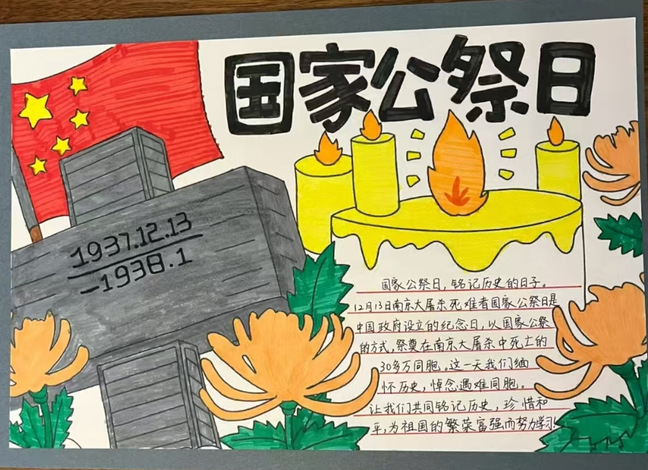 铭记历史,是为了更好地前行。此次国家公祭日手抄报活动,不仅是生活部践行校园文化建设责任的一次实践,更是一堂生动的爱国主义教育课。丰富了校园文化生活,更让同学们在潜移默化中传承了爱国精神。它让同学们在笔墨挥洒间铭记民族伤痛,在对比今昔中坚定自强信念。未来,生活部将继续策划更多有温度、有深度的校园活动,让爱国情怀在青年学子心中落地生根,让和平的种子在校园里生生不息。(撰稿人:杨文敏 审稿人:何靓)