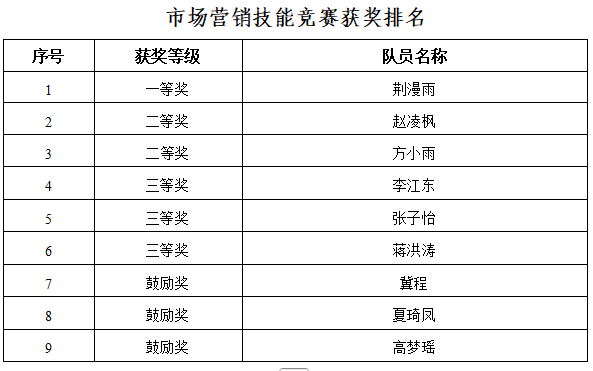 通过比赛激发了营销专业大学生学知识、提技能热情,提升了参赛选手市场分析能力、营销策划能力和情境营销能力。经过评委评分,最终6名同学分获一、二、三等奖,3名同学获鼓励奖。