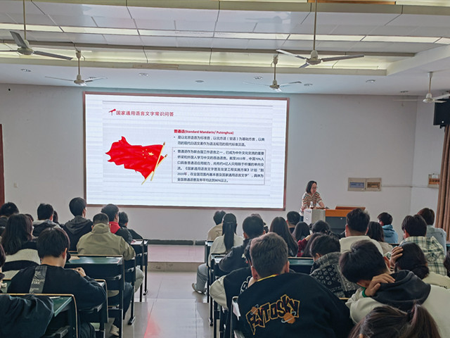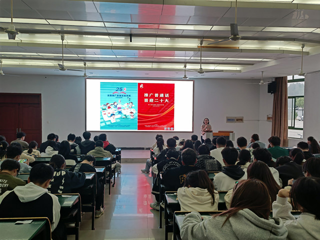 在第二十五届全国推广普通话宣传周到来之际,为推动我校语言文字工作,紧紧围绕推广普通话为主题,2022年11月4日下午,由基础部思政教研室丁娟娟老师主讲的人文素质讲座“学习二十大 推广普通话”在学院教学楼阶梯101教室举行,二百多名的学生参加活动。