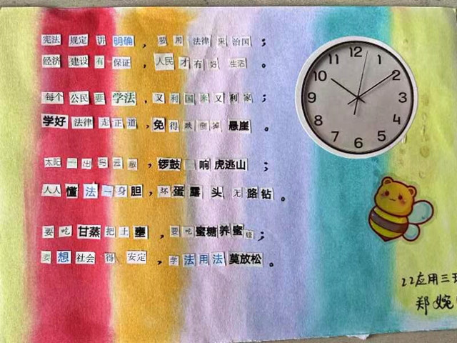 活动期间,同学们“头脑风暴”,在所给的法条上选取合适词句,重新排列组合为一首小诗,再根据自身喜好配以不同图案,不一会一首首蕴含着参与者巧思的拼贴诗便被创作完成。