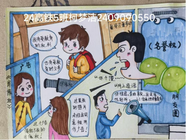 通过观察同学们为本次活动所绘制的漫画可以看出有的作品以生动的故事情节展现了法律的作用,有的则以幽默诙谐的方式揭示法律常识。漫画作品内容多种多样,涵盖了宪法、民法典、未成年人保护法、网络安全法等同时还涉及到了同学们日常生活中的所能遇到的多种场景例如毒品的危害、共同抵制校园欺凌、反诈小常识等。每一副作品都凝聚了同学们对法治的理解与热爱,通过漫画这一形式让法律知识变得生动有趣。
