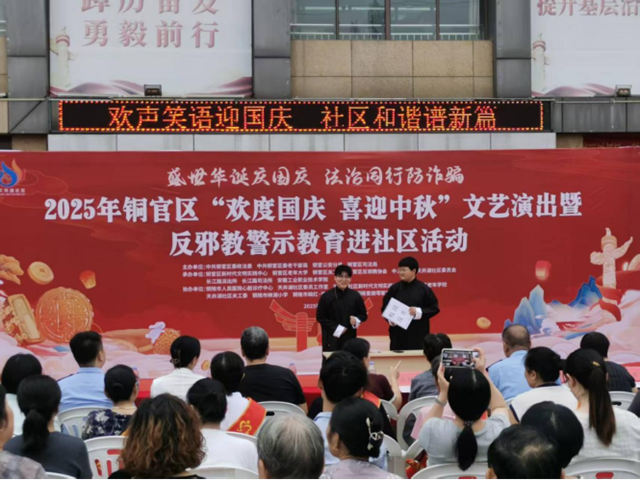 为切实提升社区居民的反诈防骗意识,筑牢基层反诈安全防线,9月28日上午,天井湖社区联合金年会多个学生社团在社区活动广场开展“欢度国庆,喜迎中秋”文艺演出暨反邪教警示教育进社区活动,以群众喜闻乐见的形式,将反诈知识送到居民身边。