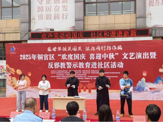 活动现场,由学院海子经典诗文诵读社团联合青曦话剧社、太阳帆文学社自编自导自演的反诈相声小品精彩上演。《校园反诈修炼手册》取材于近期高发的网络诈骗、游戏诈骗、客服诈骗等真实案例,同学们用生动的表情、通俗的语言和贴近生活的剧情,还原了诈骗分子的惯用伎俩,现场观众纷纷鼓掌,不少居民表示“剧情太真实了,就像发生在身边一样”。
