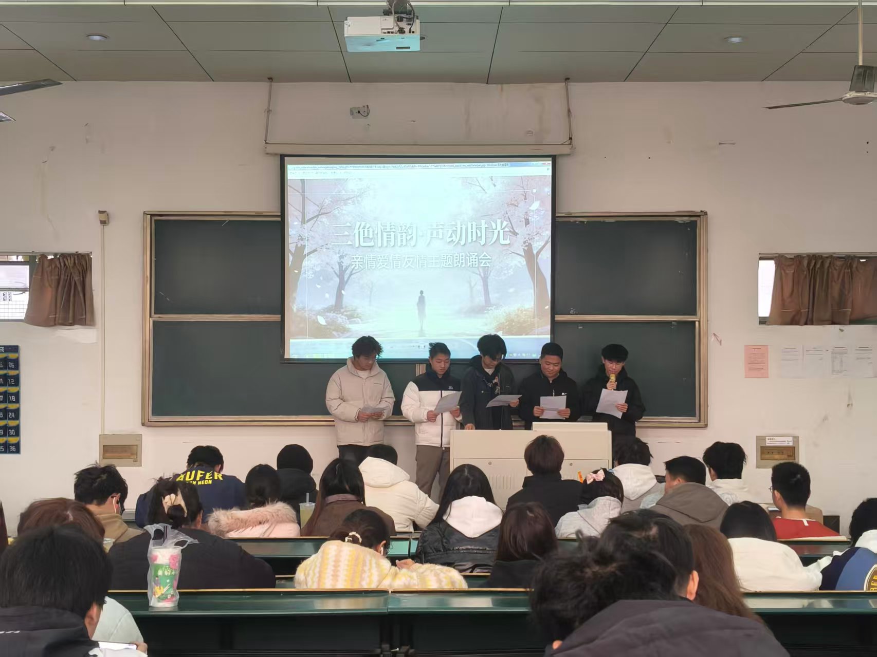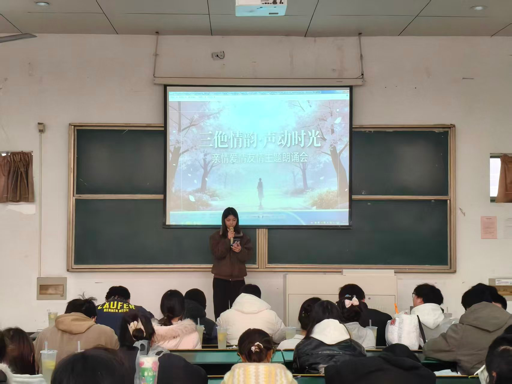 活动现场,朗诵者声情并茂,听众沉浸其中。伴随音乐与画面的衬托,每一段文字都化作情感的音符,在空间中缓缓流淌。