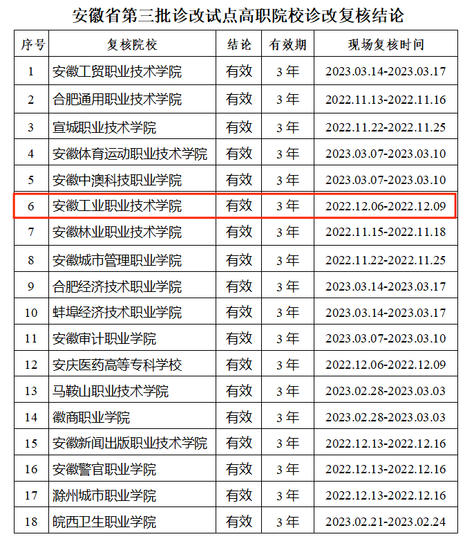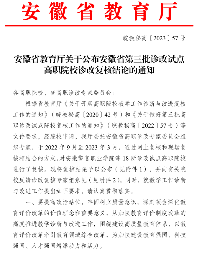 近日,省教育厅发布《安徽省教育厅关于公布安徽省第三批诊改试点高职院校诊改复核结论的通知》(皖教秘高〔2023〕57号),全省第三批职业院校诊改复核结果予以公布,金年会顺利通过安徽省职业院校教学工作诊断与改进专家委员会专家组复核,诊改复核结论为“有效”。
