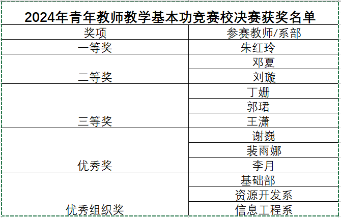 经过激烈的角逐和评委认真细致的评审,最终评选出一等奖1项,二等奖2项,三等奖3项,优秀奖3项。资源开发系,信息工程系和基础部荣获“优秀组织奖”。