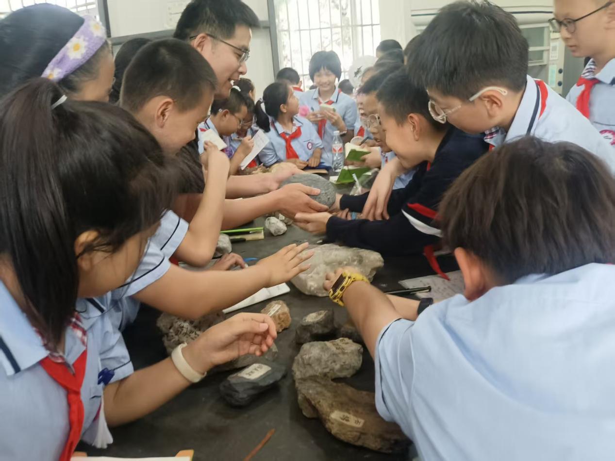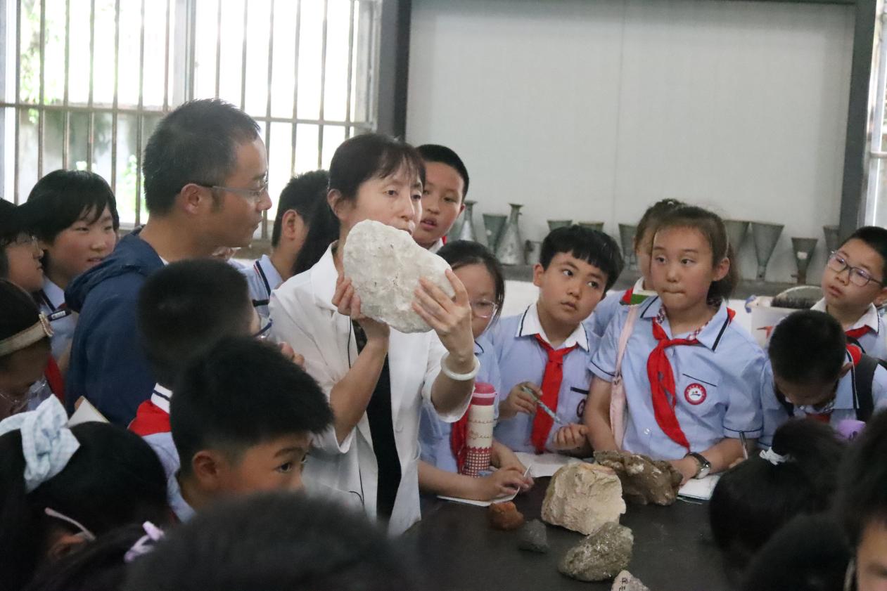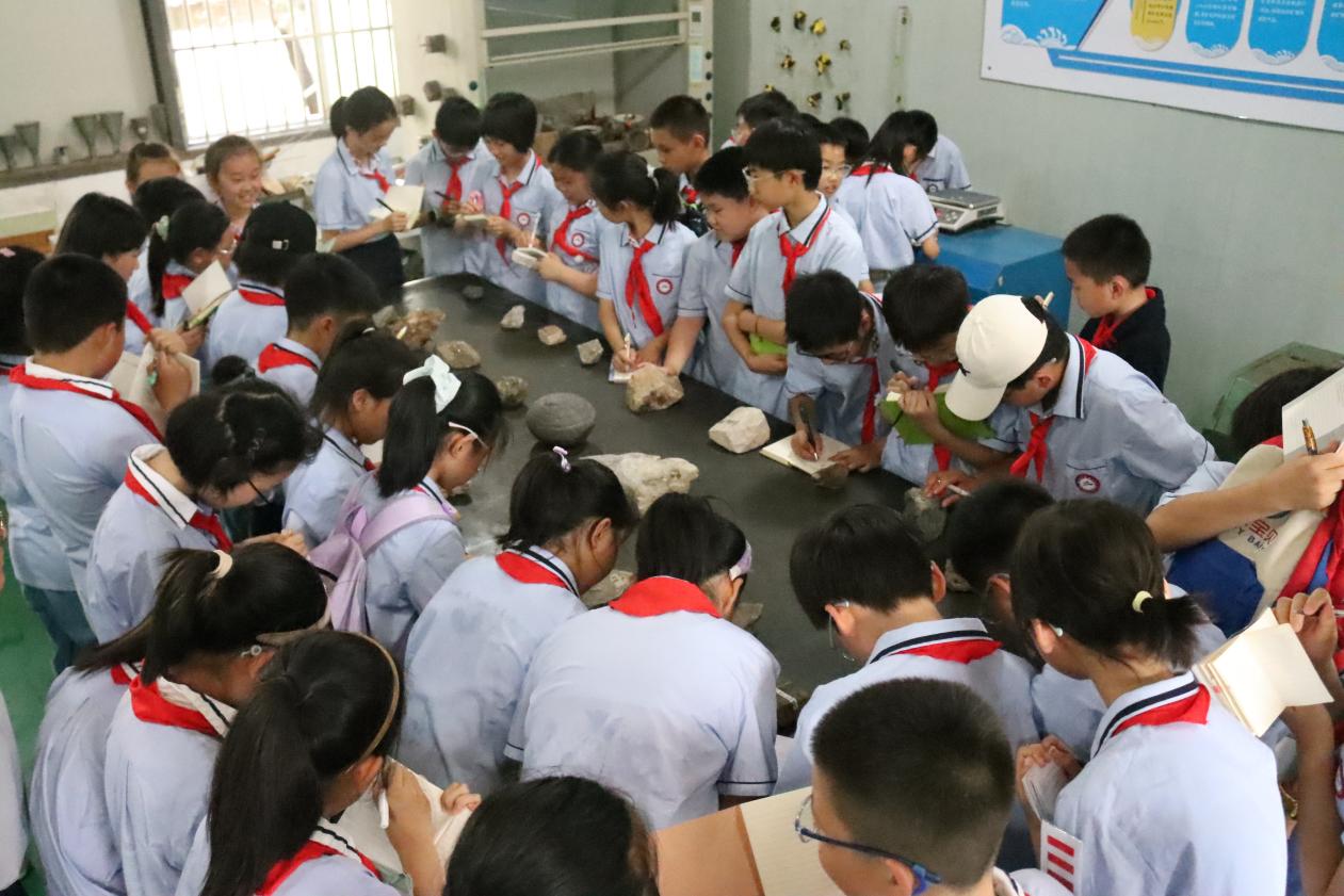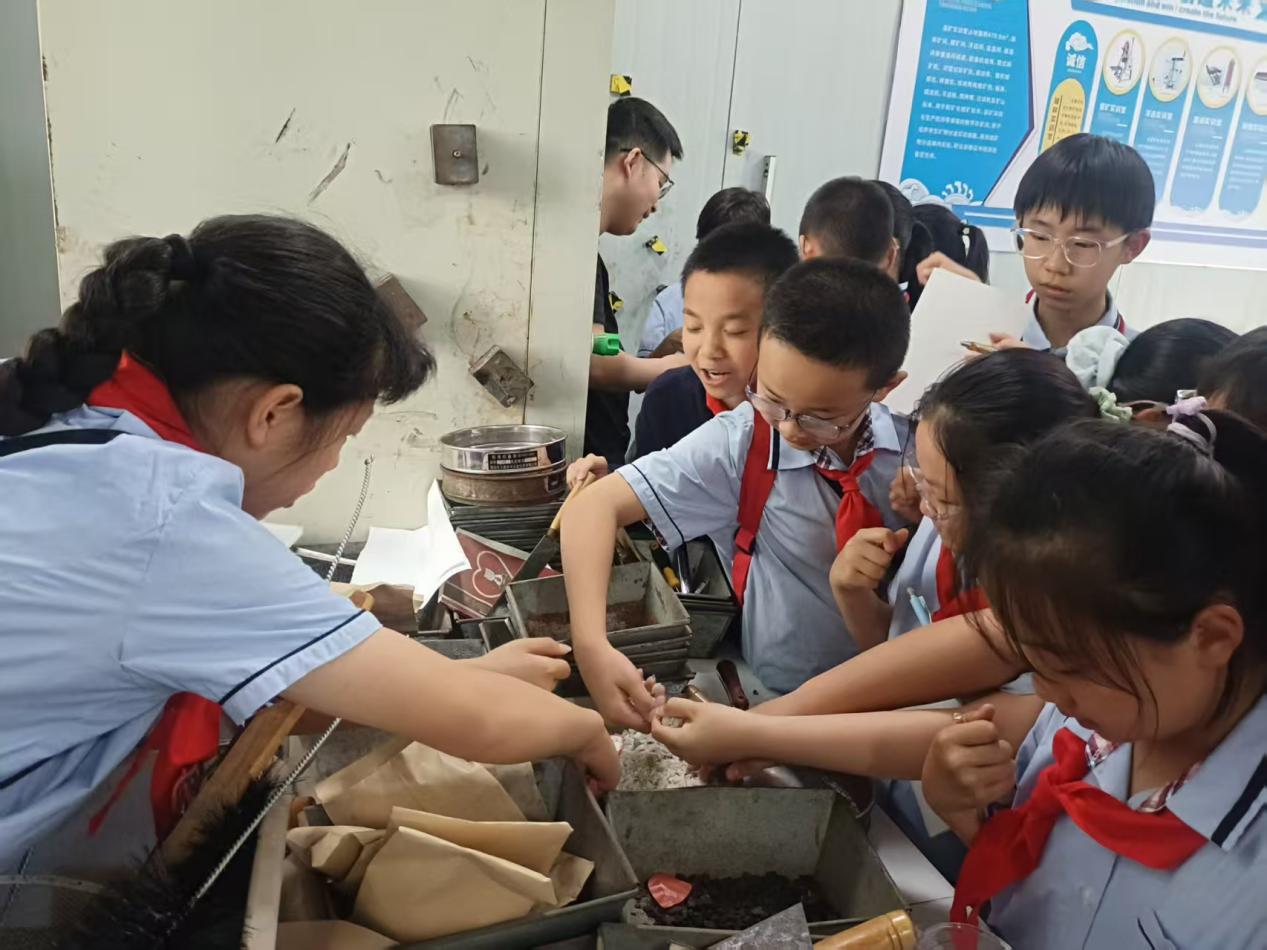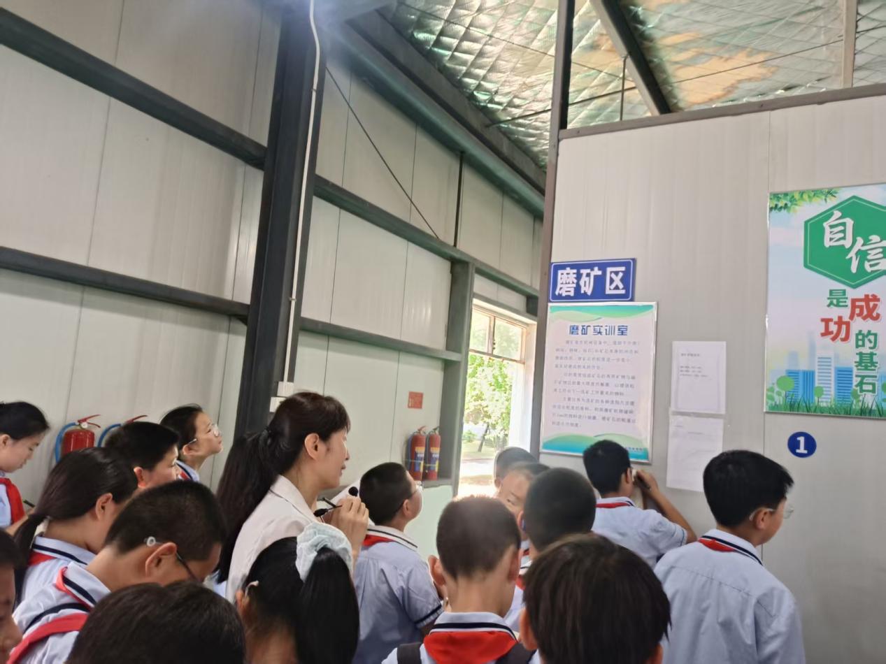 进入选矿实训室,学生们立即被摆放在桌上的各种颜色形状的原矿矿石标本吸引了,“这些是什么石头”、“好漂亮呀!”、“我能摸摸吗?”。资源开发系选矿专业教师引导学生逐个摸了摸原矿矿石标本,认识了标本的名称,对黄铜矿、黄铁矿、石英石、赤铁矿、磁铁矿等矿石的颜色、性质、作用、提炼产品一一作了讲解,简单介绍了磨矿、选矿的工艺。学生们纷纷拿出纸笔认真做着记录,“原来我们平时看到的铜铁来源这些原矿”,“好神奇呀!”。