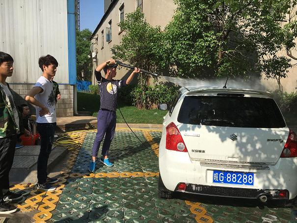 5月11日下午, 社团活动正式开始,许多位老师把车开过来让社员们进行保养。社团的同学们大显身手,他们身着迷彩军训服装,用着学校引进的专业设备,车身清洁——清洁轮毂——漆面养护——车内吸尘,有条不紊的对车辆进行美容保养。