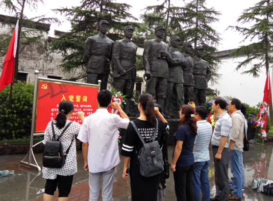 在岩寺新四军成立旧址纪念馆,大家认真听讲解员讲述新四军走过的风雨艰辛而又波澜壮阔的革命历程,瞻仰了一幅幅革命先烈生前的照片和用过的每一件物品,通过大量地文献资料、图片、实物,全体党员深刻感受到先烈们大无畏的牺牲精神和英勇地革命气概。参观结束后,全体党员向革命烈士雕塑献上花篮,并在党旗下重温了入党誓词。