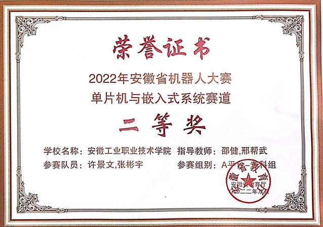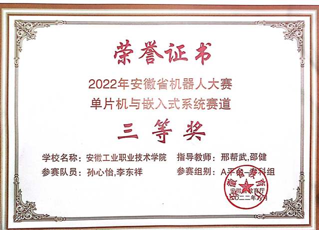为激励大学生团队合作精神,提高学生运用微控制器技术解决实际问题的综合能力,培养更多的物联网技术优秀人才。学院组织学生参加由安徽省教育厅主办的2022年安徽省机器人大赛单片机与嵌入式系统竞赛。在指导老师邢邦武、邵健的带领下,金年会代表队荣获二等奖1项,三等奖1项。