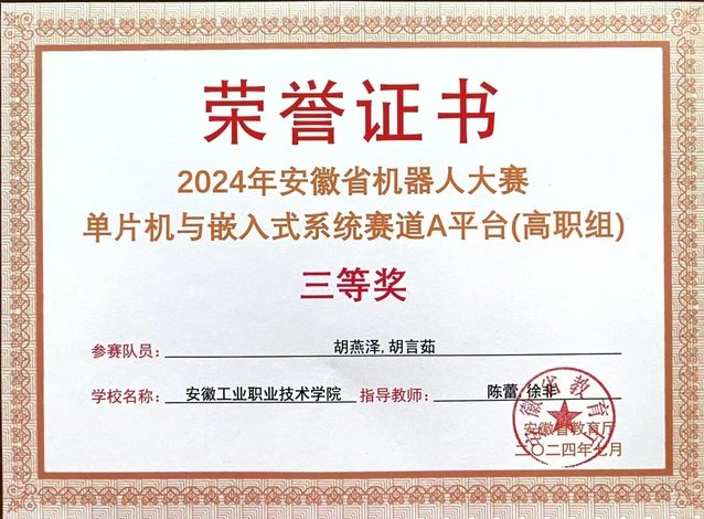 近日,备受瞩目的2024年安徽省机器人大赛圆满降下帷幕。在这场汇聚了全省顶尖科技智慧的盛会上,机电工程学院在单片机与嵌入式系统赛道A平台(高职组)中脱颖而出,再次书写辉煌篇章,一举夺得二等奖1项及三等奖3项的卓越佳绩。