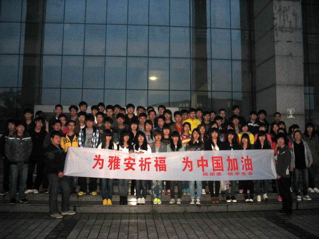 很多参加活动同学都这样说道“这次地震发生的很突然。作为一名安徽学子,我们深深感到,虽然不能凭激情去灾区当志愿者,反而阻碍救援队伍;但我们会在此为灾区人民祈福,期盼雅安人民能尽快走出灾难阴影。”近几日,学院团委通过微博平台和校内广播不断对学生更新关于地震的媒体报道,使校内的同学能够更好地了解灾情。同时号召广大青年学生集思广益,传统的捐赠方式不一定永远是最好的,一首歌赋,一束鲜花,一盏明灯,传递一份力量,心灵的慰藉和鼓励,才是现在最需要的。