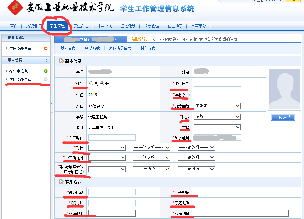 学工系统中2015级学生的信息导入已初步完成,通过检查发现在获取学生信息方面没有全面进行信息导入,现请各系自行安排学生完善学工系统内的详细信息。请于12月18日之前完成,各系自查之后,学生处抽查。