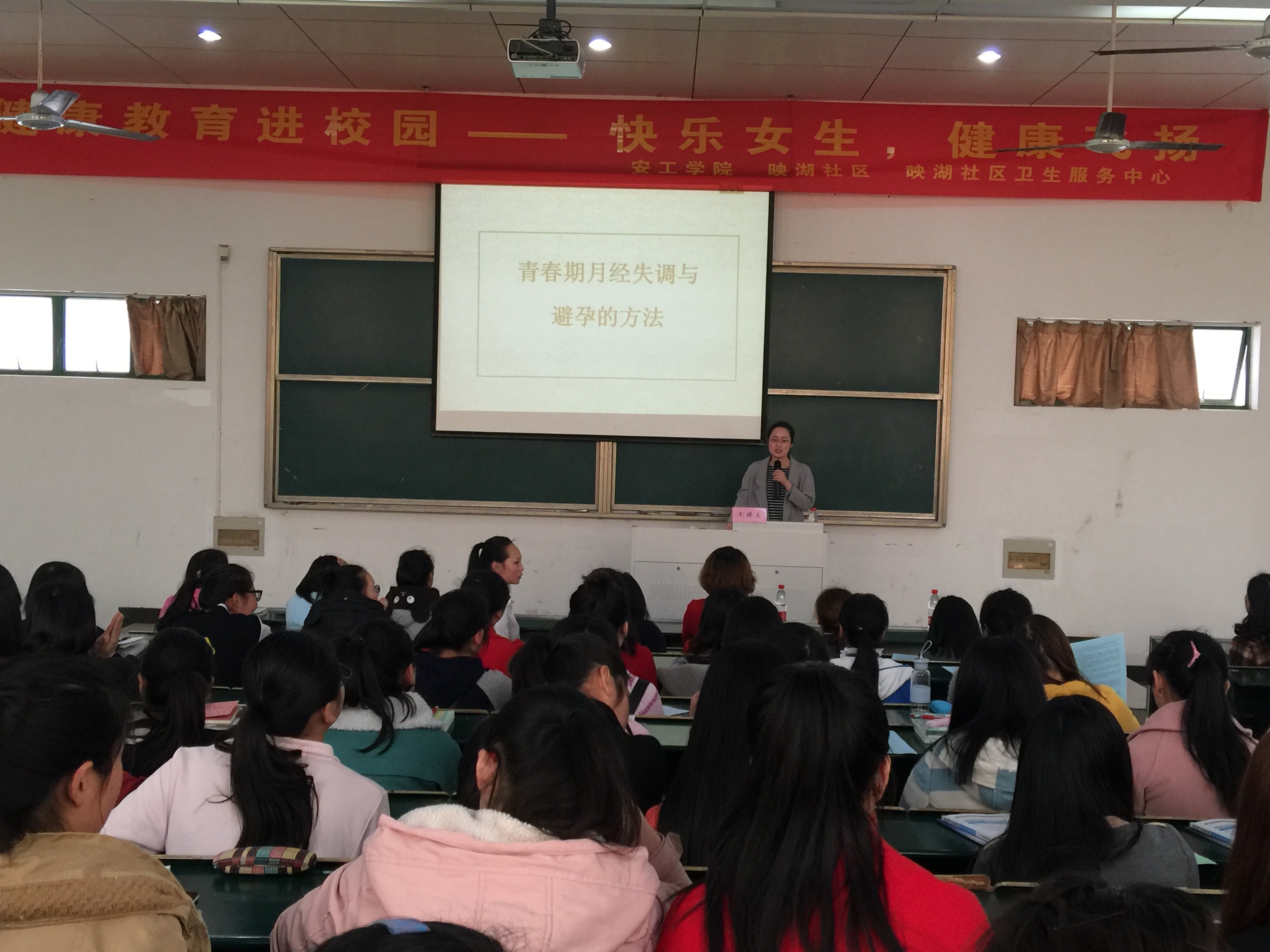 3月7日下午四点,学院联合映湖社区、映湖社区卫生服务中心在教学楼阶梯教室202共同举办了“青春俱乐部”系列主题教育活动之“快乐女生·青春飞扬”青春期健康知识讲座。来自管理系15级会计2班、3班的120余名女生到场认真聆听了讲座。