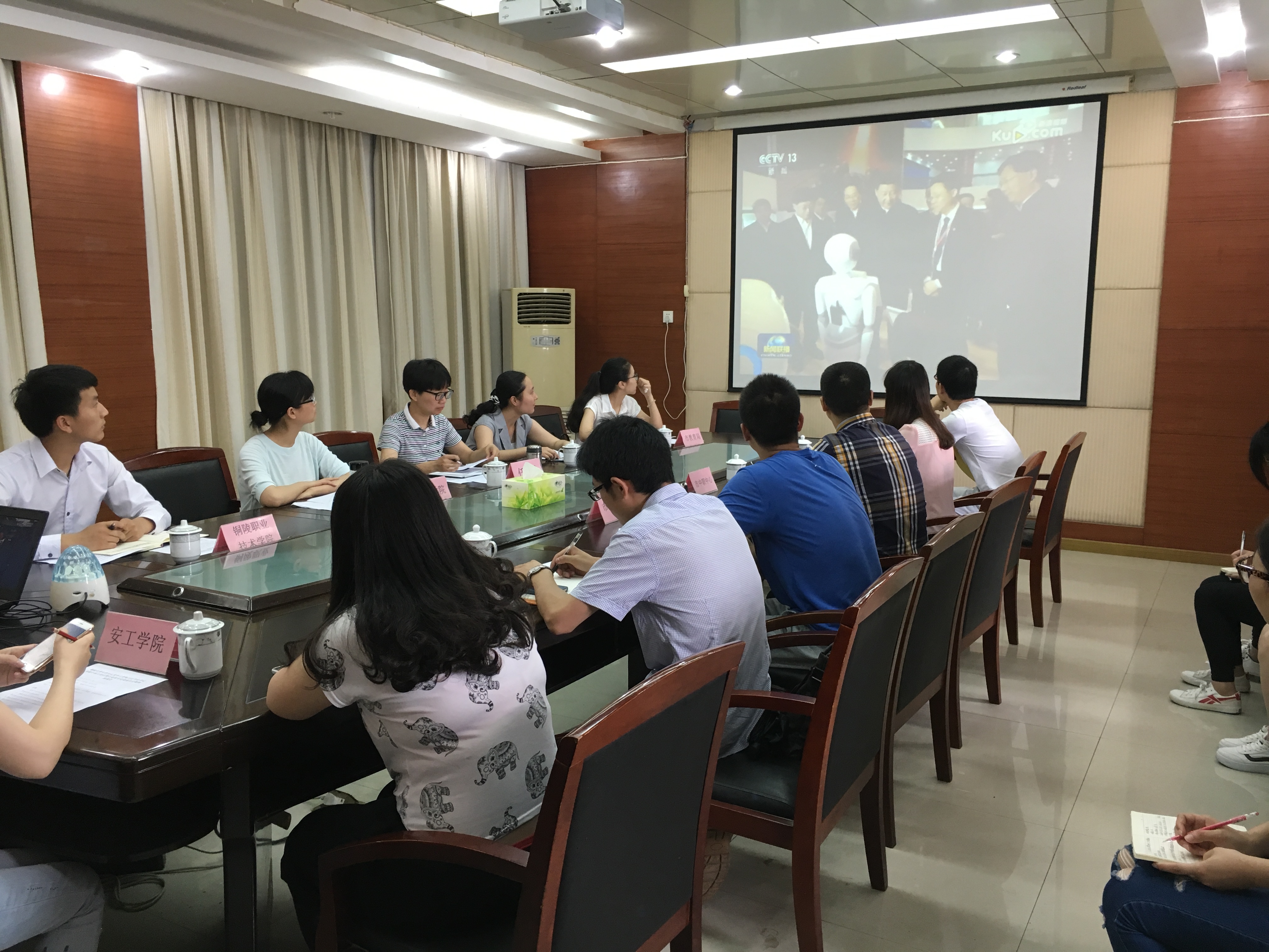 会上,传达了习近平总书记考察中科大讲话精神,市委书记宋国权在铜陵学院所作的形势政策暨党课报告精神。与会师生代表分别结合自身实际,从不同的角度畅谈心得体会。市学联主席、铜职院郑旭康同学认为,青年学生应该学会用社会主义核心价值观来明辨是非,要切实做到“道路自信、理论自信、制度自信”,在实现中国梦的伟大征程上凝聚青春才智,贡献青春力量。安工学院章敏同学表示要珍惜宝贵青春年华,坚定理想信念,立志报效祖国。青年教师代表张小祥表示将结合工作,立足岗位,汇聚青春正能量,为教育事业的发展做出更大的贡献。