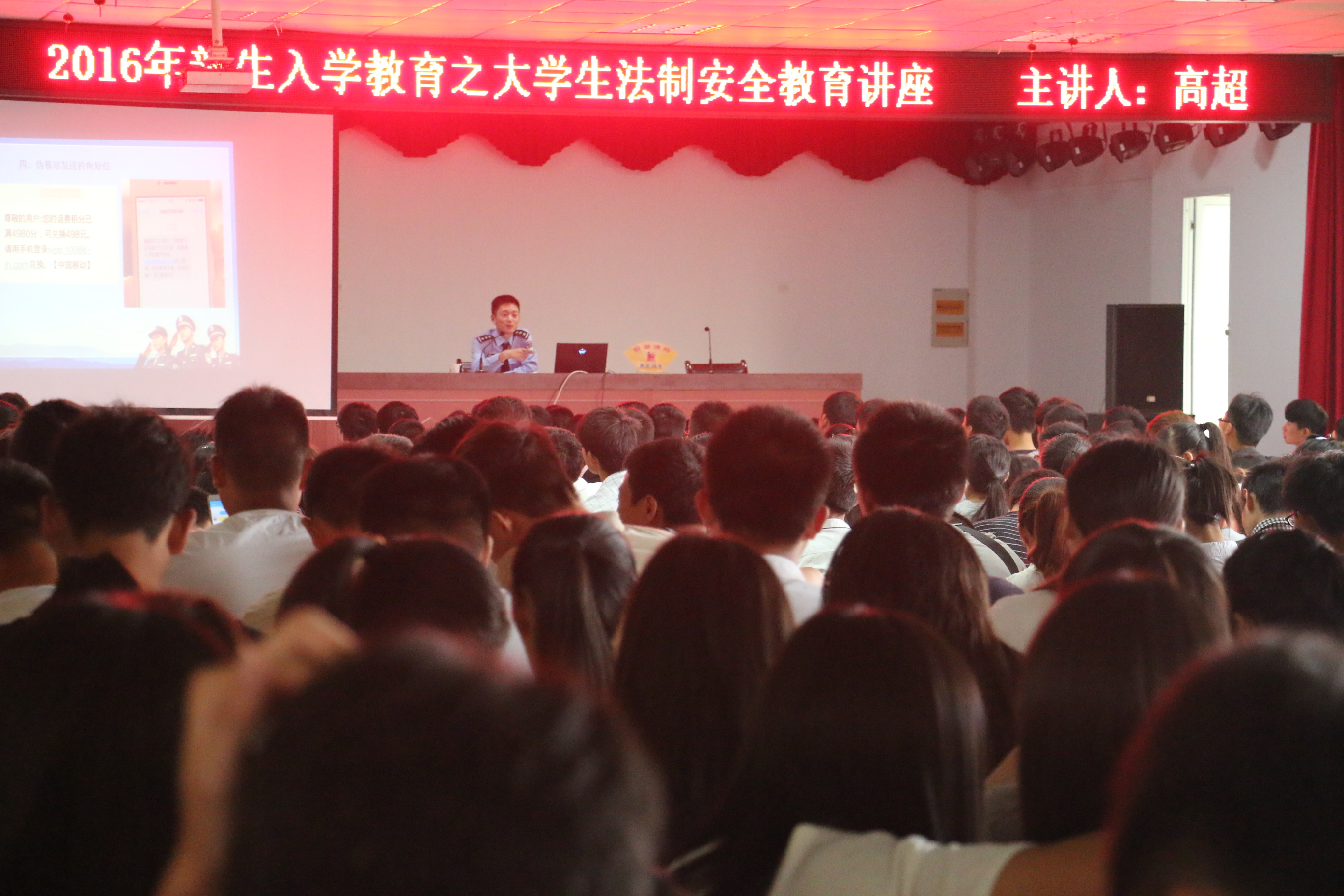 为普及校园安全防范知识,提高大学生安全防范意识和能力,降低涉及伤害大学生的案件发案率,培养大学生懂法、守法思维,维护学院的安全稳定局面,9月23号上午,学院邀请了市公安局开发区分局团支部书记高超警官在大学生活动中心举办了主题为“美丽青春·平安校园”的新生入学安全教育讲座,2016级新生代表及辅导员,共计510人参加了此次讲座。