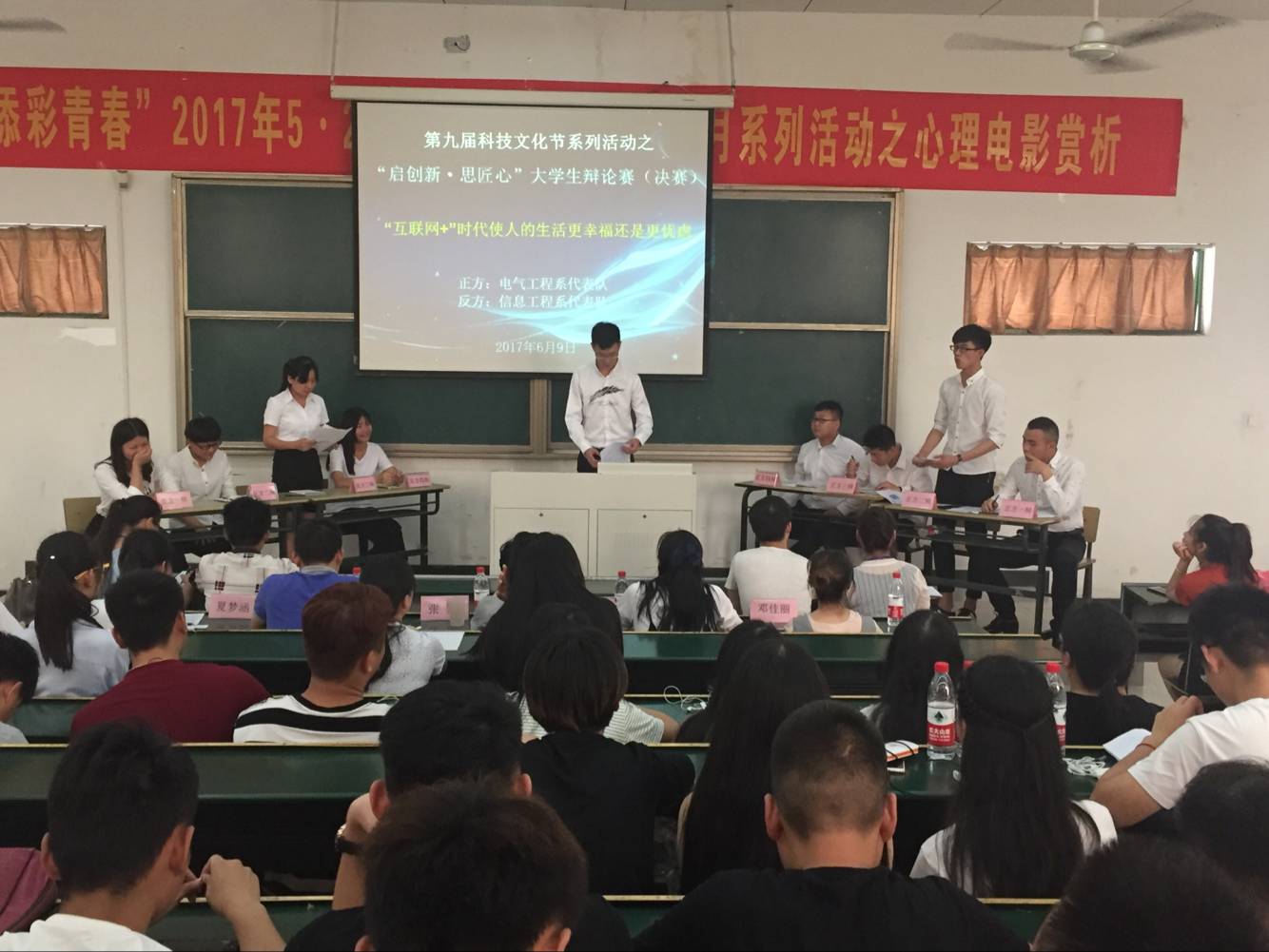 为积极宣传和营造学院建设“创新创业”的良好氛围,引导广大青年学生树立“大众创业万众创新”的观念,通过文化活动培养校园思辨风气,展现学院学子能言善辩、积极进取的风采,6月9日中午,学院举办了辩题为“互联网+时代使人的生活更幸福还是更忧虑”的大学生辩论赛决赛,100名学生观众观看了此次比赛。