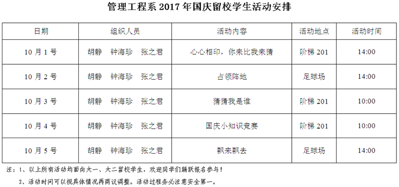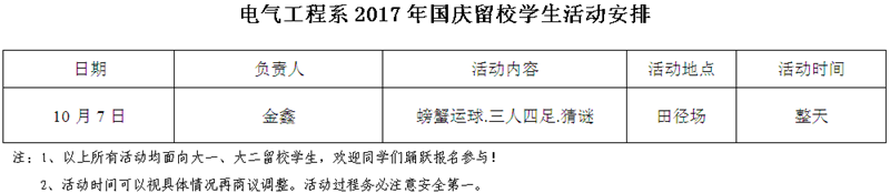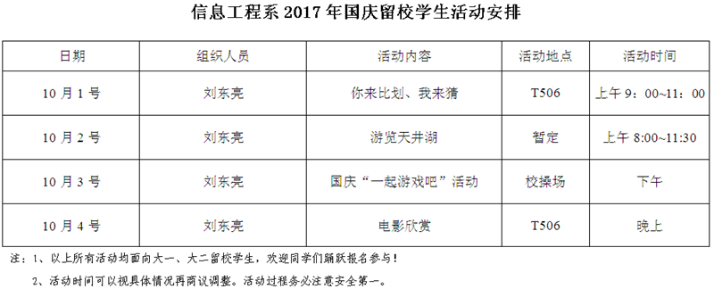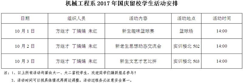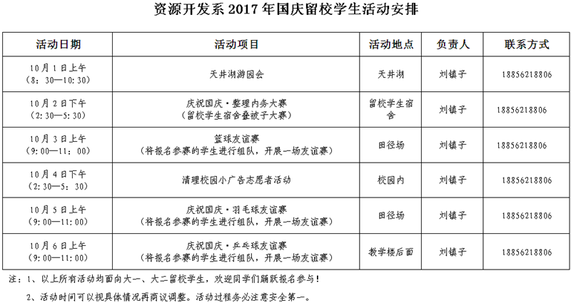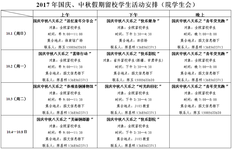 2017年国庆、中秋假期留校学生活动安排
