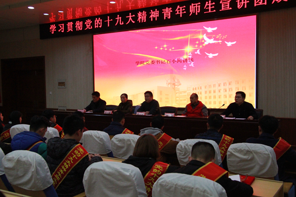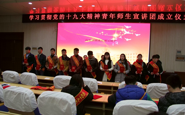 12月15日下午,学院举行了隆重热烈的“学习贯彻党的十九大精神青年师生宣讲团”成立仪式。成立仪式上,学院党委领导向宣讲团成员颁发了宣讲员聘书,院学生会主席陈玉同学代表全体宣讲团成员做了表态发言,他表示将进一步增强学习的积极性和主动性,力求学早、学通、学透、学精,把握精神实质,做到了然于胸,原原本本、生动活泼地宣讲好十九大精神。学院党委书记石小河出席会议并做了动员讲话。他就宣讲团如何做好宣讲工作和青年学生如何在新时代健康成长成才向在场近200名大学生做了一场精彩的“微党课”。他希望广大青年学生用习近平新时代中国特色社会主义思想武装头脑,坚持读原著、学原文、悟原理,做到学深悟透。要不忘初心,牢记青年的光荣使命,做社会主义合格的建设者和接班人。