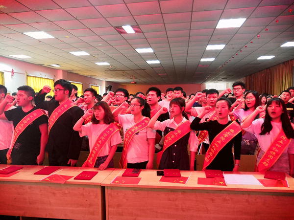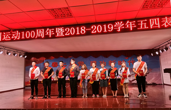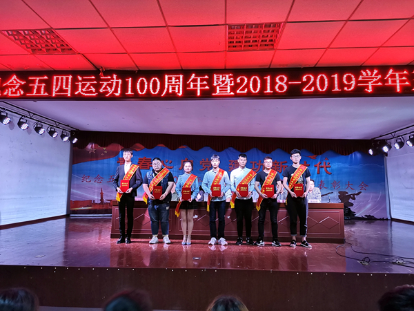 表彰大会在雄壮的国歌声中拉开序幕。团委工作人员宣读《关于表彰2018-2019学年“五四”先进集体和个人决定》,对在学院共青团工作中表现突出的先进集体和个人进行了表彰,出席会议的领导依次为获奖者代表颁奖。三名学生代表作为受表彰集体和个人先后发言,分享了他们在前进路上的工作经历和感人故事,抒发青春心向党、建功新时代的豪情。随后全体与会人员面向国旗,接力宣誓,致敬五四100周年。