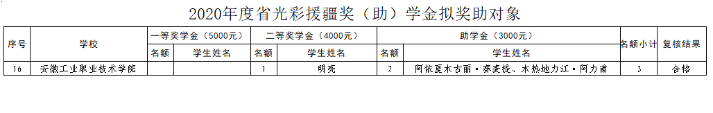 根据《安徽省光彩援疆奖(助)学金实施细则(试行)》,按照程序,现将2020年度安徽省光彩援疆奖(助)学金拟奖助对象名单进行公示,公示时间为2021年4月12日至4月19日。